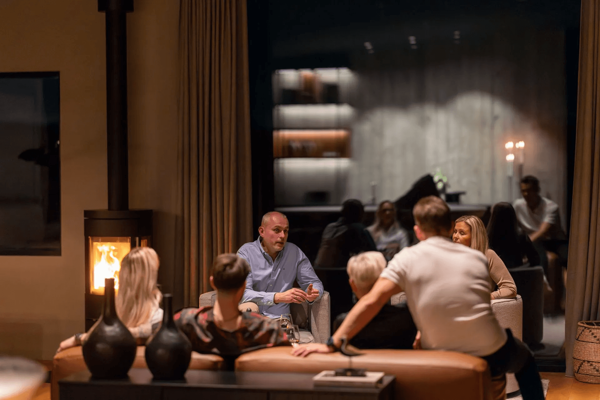 Relax in the glass-enclosed Northern Lights lounge and enjoy panoramic views of the aurora from the warmth of the villa. A private chef and host provide personalized dining, while daily cleaning ensures a seamless stay. Floor-to-ceiling windows frame breathtaking mountain vistas for an unforgettable experience.
